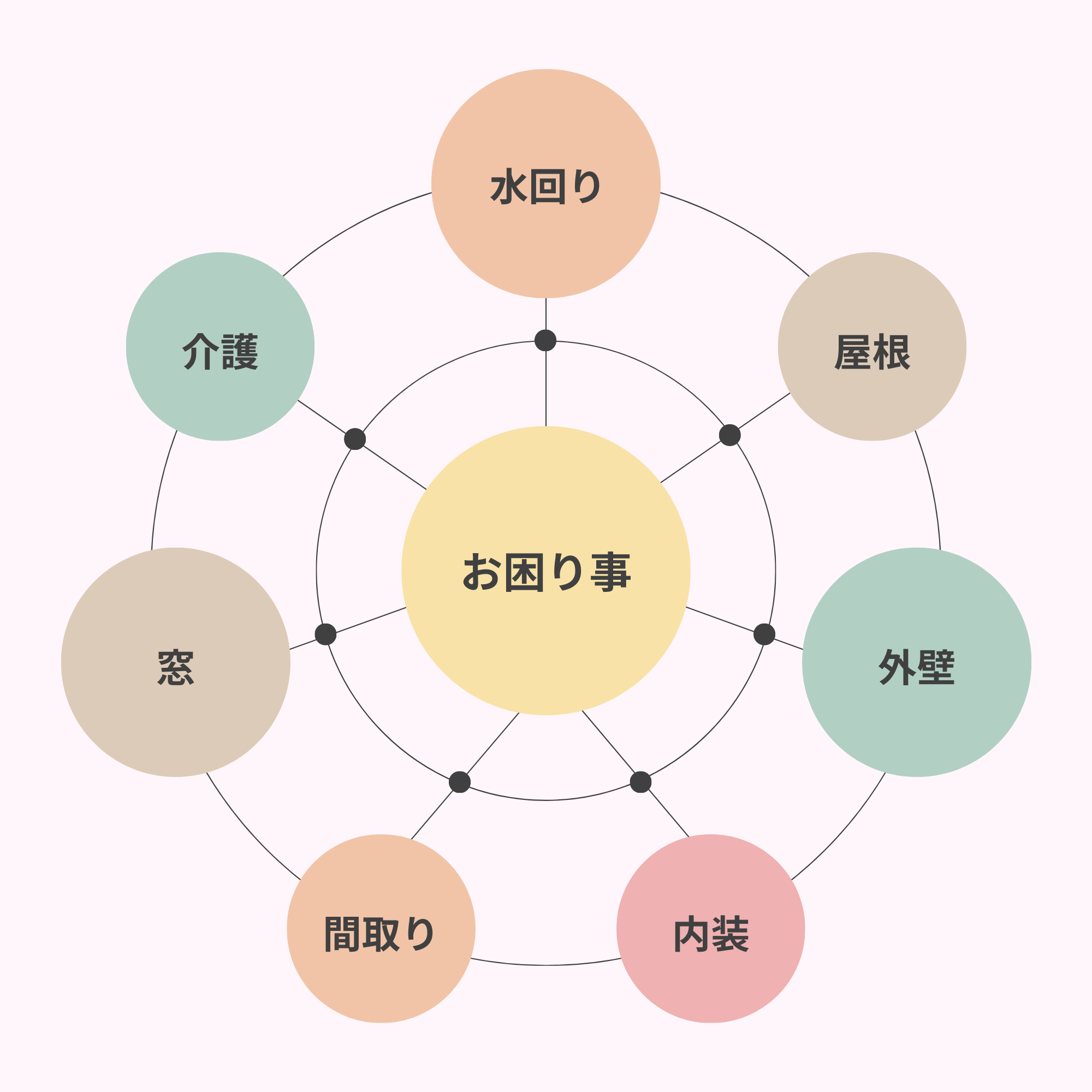 例えばお困り事の種別を7つのグループに分けるとします。『水回り』においては、漏水だったり汚れだったり、部品の故障、機器そのものの老朽化などに対する対応、『窓』に至っては、遮熱対策一つとっても、サッシ交換・内窓サッシ取り付け、遮熱塗料の塗布など、現場状況とご予算に合わせて提案は様々です。このようにお施主様は大きなことから小さなことまで様々なお困り事を抱え、何処に頼もうか?どのように直すのが最善か?お悩みになるケースが多いのではないでしょうか。横川組では、ハウスメーカーでは効かないフットワークで、地元を中心に一つ一つ丁寧に対応しております。悩んだらまずは横川組へご相談ください!